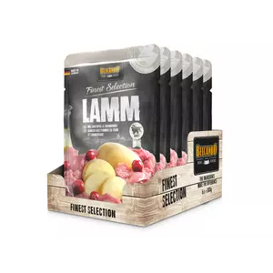 BELCANDO (Белькандо) Баранина з картоплею та брусницею – чудовий смак в індивідуальних порціях. Соковите м'ясо приправлене добірними інгредієнтами, дбайливо готується окремими порціями. Завдяки маслу будяка холодного віджиму, рецептура п'яучої збагачена поліненасиченими жирними кислотами. Надзвичайно смачний та легкозасвоюваний корм Belcando Finest Selection відмінно підходить для чутливих та розбірливих собак.
