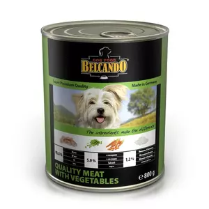 BELCANDO (Белькандо) Добірне м'ясо з овочами – високоякісний консервований корм для Вашої собаки. 5 різних видів консервів, сировина для яких поставляється від надійних німецьких фермерських господарств. Використовуються не формовані м'ясні вироби, лише справжні шматки м'яса. Кожен вид має оригінальний склад інгредієнтів і містить цінну олію чортополоху, багату на поліненасичені жирні кислоти.