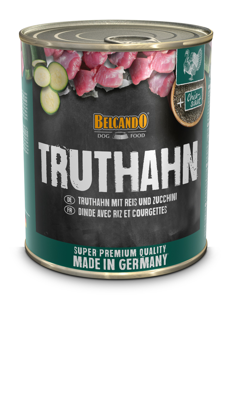 BELCANDO (Белькандо) Індичка з рисом та цукіні - НОВІ КОНСЕРВИ BELCANDO – якісний німецький продукт, виготовлений із натуральної сировини. Шість унікальних рецептур з великою кількістю м'яса мають у складі ряд цінних компонентів: олія будяка багата жирними кислотами, що покращують кровообіг і харчування тканин; насіння чиа для підтримки травлення, здоров'я шкіри та вовни. У виробництві консервів не використовуються барвники, ароматизатори та консерванти.