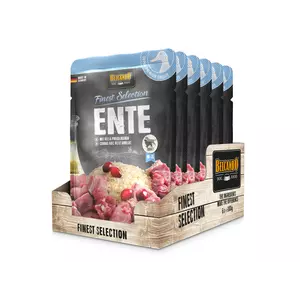 BELCANDO (Белькандо) Качка з рисом та брусницею – чудовий смак в індивідуальних порціях. Соковите м'ясо приправлене добірними інгредієнтами, дбайливо готується окремими порціями. Завдяки маслу будяка холодного віджиму, рецептура п'яучої збагачена поліненасиченими жирними кислотами. Надзвичайно смачний та легкозасвоюваний корм Belcando Finest Selection відмінно підходить для чутливих та розбірливих собак.