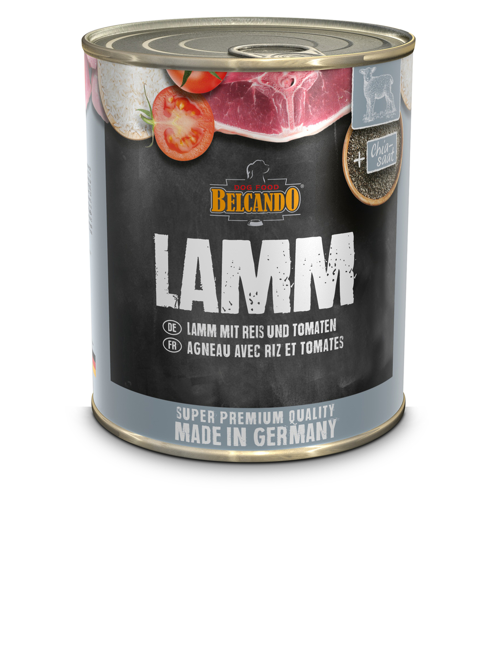 BELCANDO (Белькандо) Ягня з рисом та помідорами - НОВІ КОНСЕРВИ BELCANDO – якісний німецький продукт, виготовлений з натуральної сировини. Шість унікальних рецептур з великою кількістю м'яса мають у складі ряд цінних компонентів: олія будяка багата жирними кислотами, що покращують кровообіг і харчування тканин; насіння чиа для підтримки травлення, здоров'я шкіри та вовни. У виробництві консервів не використовуються барвники, ароматизатори та консерванти.