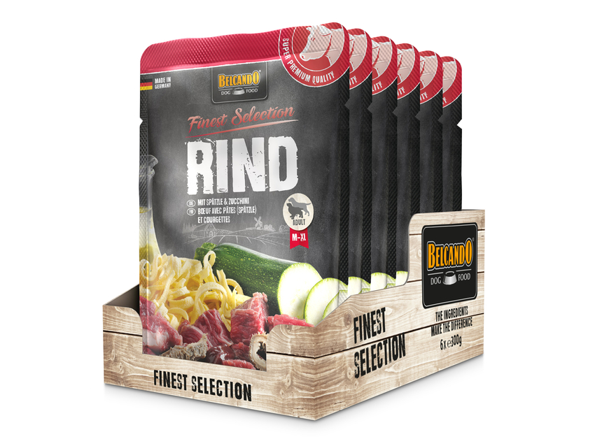BELCANDO (Белькандо) Яловичина з локшиною та цукіні - чудовий смак в індивідуальних порціях. Соковите м'ясо приправлене добірними інгредієнтами, дбайливо готується окремими порціями. Завдяки маслу будяка холодного віджиму, рецептура п'яучої збагачена поліненасиченими жирними кислотами. Надзвичайно смачний та легкозасвоюваний корм Belcando Finest Selection відмінно підходить для чутливих та розбірливих собак.